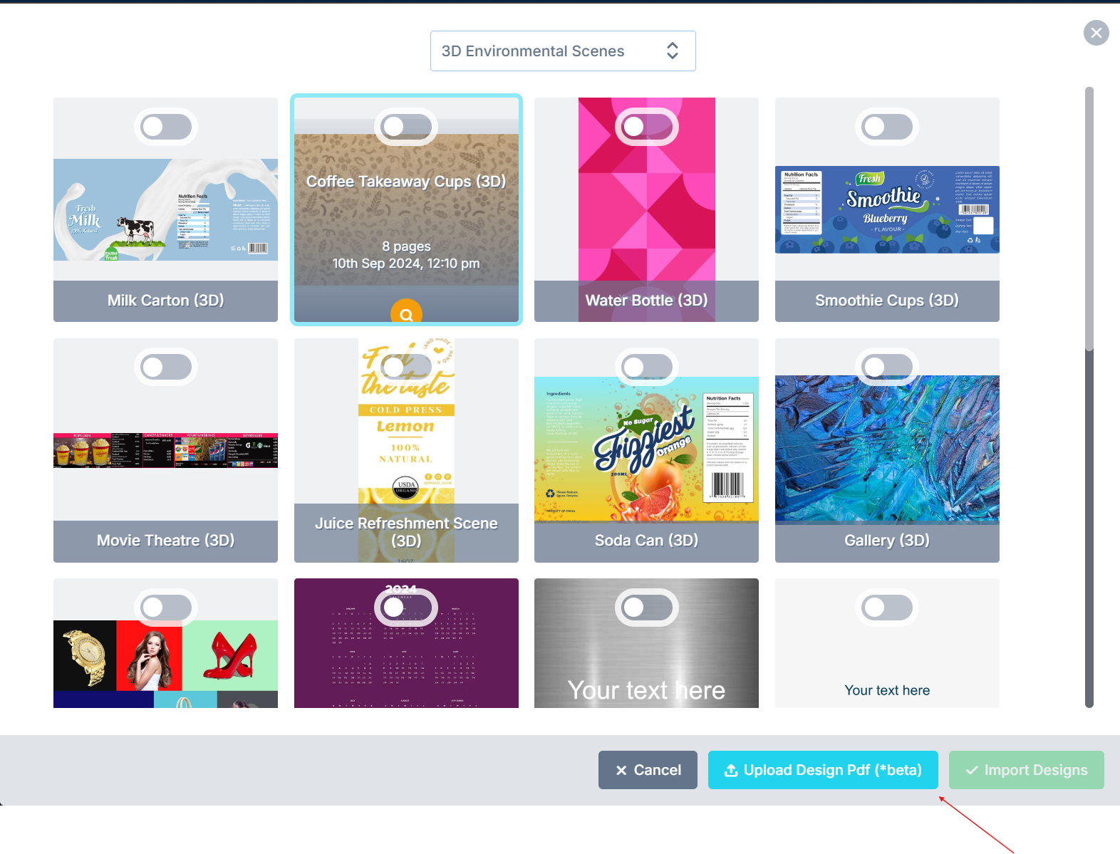 To make use of the PDF uploader please go to Designs >> Click on Import Designs.