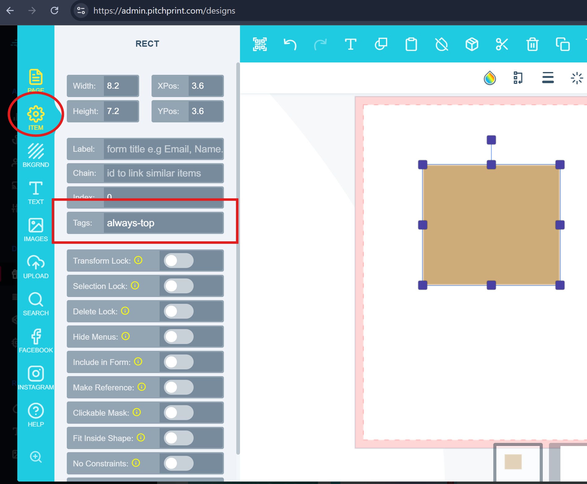 By applying this tag, the element will automatically stay in the foreground, even as customers add new images or text to the design.